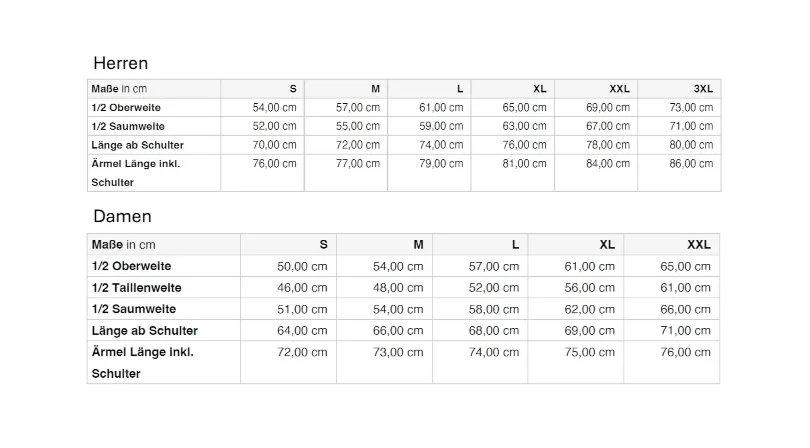 XS, S, M, L, XL, 2XL, 3XL